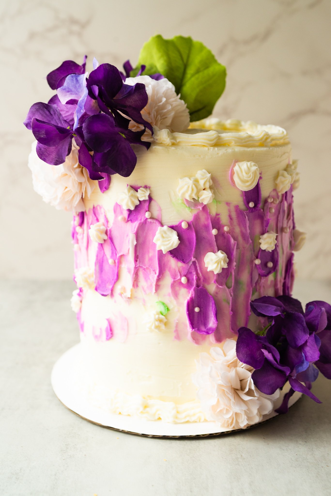 A freshly baked cornbread with a pat of butter on top, in a small black cast iron skillet placed on a striped cloth on a white marble surface.